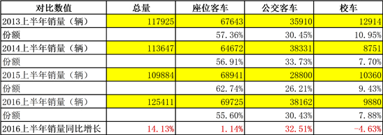 據(jù)中國客車統(tǒng)計信息網37家企業(yè)(此前45家)統(tǒng)計數(shù)據(jù)顯示,2013年起連續(xù)三個上半年客車銷量,一直處于下滑態(tài)勢。不過,2016上半年客車以125411輛銷量迅速回暖,同比去年同期增長14.1%,市場向好趨勢明顯。