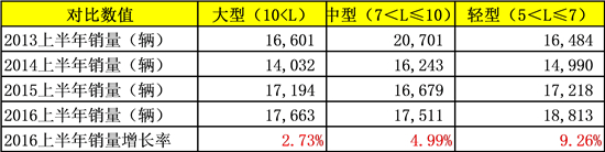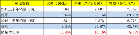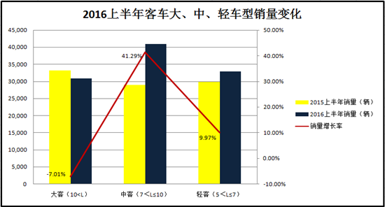 盡管座位客車上半年增長僅1.1%,但從各車型銷量變化來看,中型、輕型座位客車市場表現(xiàn)較好。