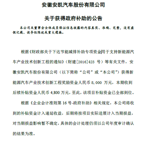 2016年8月1日公告,根據(jù)《財政部關于下達節(jié)能減排補助專項資金用于支持新能源汽車產(chǎn)業(yè)技術創(chuàng)新工程的通知》(財建[2016]423號)等有關文件,公司獲得新能源汽車產(chǎn)業(yè)技術創(chuàng)新工程獎勵資金人民幣8000萬元,本期收到后續(xù)補貼資金人民幣4800萬元,至此,該項目補貼資金已全部到位。