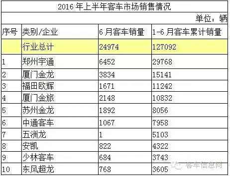 據(jù)中國(guó)客車統(tǒng)計(jì)信息網(wǎng)數(shù)據(jù)顯示,2016年1-6月,國(guó)內(nèi)累計(jì)銷售各類客車127092輛,其中,包括座位客車70713輛,公交客車38835輛,校車9888輛,臥鋪及其他客車7656輛。在各企業(yè)銷量中,宇通客車無論是整體銷量,還是各個(gè)細(xì)分市場(chǎng)銷量,均居行業(yè)之首,充分顯示了其作為行業(yè)龍頭企業(yè)的實(shí)力。