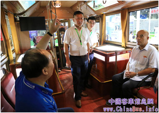 中國(guó)道路運(yùn)輸協(xié)會(huì)城市客運(yùn)分會(huì)理事長(zhǎng)張國(guó)光(右一)為仿古鐺鐺車舒適的乘坐體驗(yàn)點(diǎn)贊