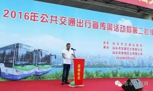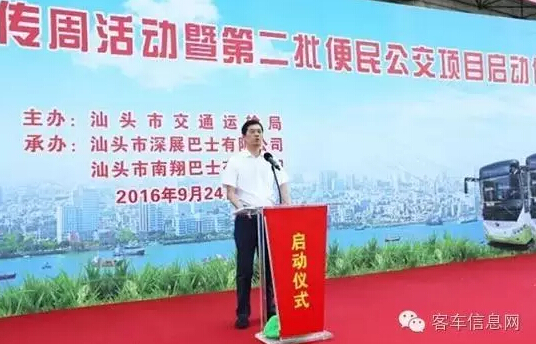 9月24日上午,由汕頭市交通運輸局主辦,汕頭市深展巴士有限公司、汕頭市南翔巴士有限公司承辦,珠海銀隆新能源有限公司協(xié)辦的2016年公共交通出行宣傳周活動暨第二批便民公交項目啟動儀式在汕頭市舉行。汕頭市長劉小濤、副市長李耿堅、市政協(xié)副主席杜懷丹、交通運輸局局長陳少輝、公交管理處處長林荔松等領(lǐng)導(dǎo)參加了本次活動。