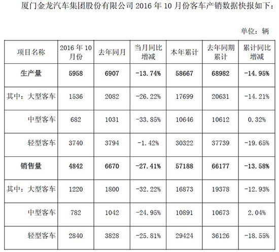 11月10日,廈門金龍汽車集團(tuán)股份有限公司公布2016年10月份產(chǎn)銷數(shù)據(jù)。公告顯示,10月份,金龍汽車銷售各類客車4842輛(包括蘇州金龍海格客車、廈門金龍和廈門金旅這三條“金龍”),同比下降27.41%;生產(chǎn)各類客車5958輛,同比下降13.74%。今年1-10月,金龍汽車集團(tuán)累計銷售各類客車57188輛,同比下降13.58%;累計生產(chǎn)各類客車58667輛,同比下降14.95%。