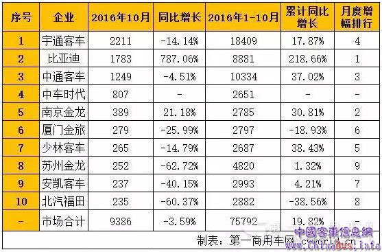 據(jù)中國客車統(tǒng)計信息網(wǎng)數(shù)據(jù)顯示,2016年10月,國內(nèi)公交客車銷量為9386輛,同比下降3.59%。2016年1-9月,國內(nèi)公交客車累計銷售75792輛,同比增長19.82%,占據(jù)6米以上客車市場總銷量的49.64%。