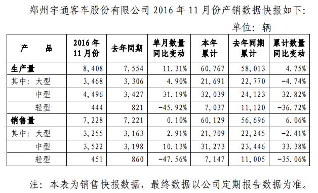 12月3日,鄭州宇通客車股份有限公司2016年11月份產(chǎn)銷數(shù)據(jù)快報(bào)??靾?bào)顯示11月份,宇通銷售各類客車7228輛,同比增長(zhǎng)0.1%;1-11月,宇通累計(jì)銷售各類客車60129輛,同比增長(zhǎng)6.06%。