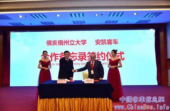 美國俄亥俄州立大學(xué)汽車研究中心主任 Giorgio Rizzoni、安凱客車總經(jīng)理查保應(yīng)共同簽署合作備忘錄