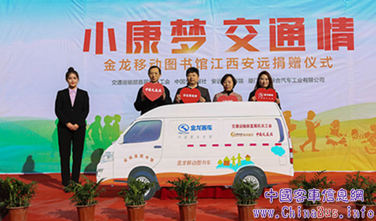 12月9日,正值滿山遍野臍橙飄香的豐收季節(jié),以“小康夢 交通情”為主題的“金龍移動圖書館”捐贈儀式在江西安遠(yuǎn)舉行。在交通運(yùn)輸部直屬機(jī)關(guān)工會、中國交通報社、江西安遠(yuǎn)縣政府、金龍客車的共同見證與參與下,“金龍移動圖書館”正式在安遠(yuǎn)地區(qū)啟動,服務(wù)當(dāng)?shù)剜l(xiāng)村和學(xué)校,實現(xiàn)孩子們有書讀、讀好書的心愿。