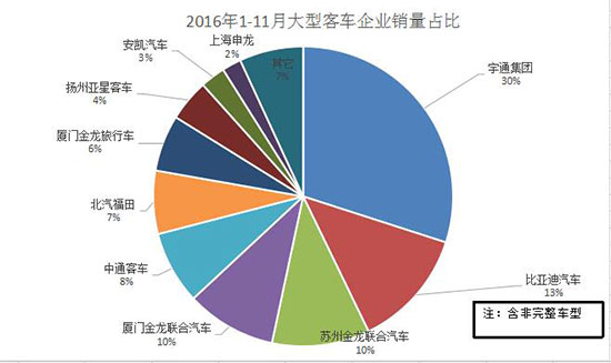 今年前11個月,大型客車產銷7.57萬輛和7.25萬輛,同比增長4.71%和3.43%。在大型客車市場,宇通客車的冠軍地位依舊穩(wěn)固,占據(jù)30%的市場份額。值得一提的是,比亞迪今年在大型客車市場的表現(xiàn)尤為引人側目,前11個月累計同比199.87%的高幅增長,也讓它穩(wěn)坐了2016年大型客車銷量的亞軍寶座,市場份額更是飆升至13%。