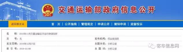 12月27日,交通運輸部綜合規(guī)劃司發(fā)布2016年11月交通運輸經(jīng)濟(jì)運行數(shù)據(jù)。其中,公路客運延續(xù)下降態(tài)勢。11月,完成營業(yè)性客運量11.9億人,同比下降3.4%,降幅與上月基本持平。1-11月,累計完成客運量142.4億人,同比下降4.7%。 以下是文件全文: