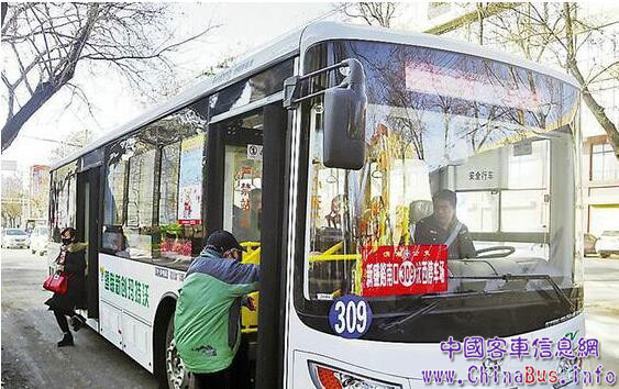 12月27日,在城區(qū)勝利大街小寨小學(xué)公交站牌,市民走向309路電動(dòng)公交車(chē)準(zhǔn)備乘車(chē)。從2016年12月26日起,渭南城區(qū)新增的26輛電動(dòng)公交車(chē)上路運(yùn)營(yíng)。