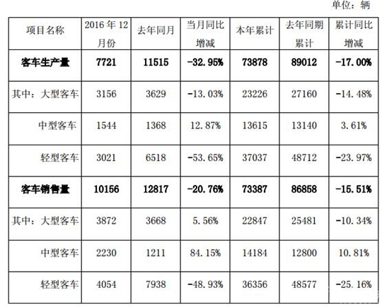 廈門金龍汽車集團(tuán)股份有限公司發(fā)布2016年12月份產(chǎn)銷數(shù)據(jù)快報(bào)。銷量方面:廈門金龍汽車2016年12月份銷售各類客車10156輛,同期下降20.76%;1-12月份銷售客車73387輛,同比下降15.51%。細(xì)分來看,大型客車2016年12月份銷售3872輛,同期增長(zhǎng)5.56%;1-12月份銷售大型客車22847輛,同比下降10.34%。中型客車2016年12月份銷售2230輛,同期大漲84.15%;1-12月份銷售中型客車14184輛,同比增長(zhǎng)10.81%。輕型客車2016年12月份銷售4054輛,同期大降48.93%;1-12月銷售輕型客車36356輛,同比下降25.16%。