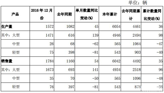 生產(chǎn)方面:揚(yáng)州亞星客車2016年12月份生產(chǎn)各類客車1572輛,同期增長45%;1-12月份生產(chǎn)客車6054輛,同比增長36%。細(xì)分來看,大型客車2016年12月份生產(chǎn)1471輛,同期增長139%;1-12月份生產(chǎn)大型客車4946輛,同比增長98%。中型客車2016年12月份生產(chǎn)26輛,同期下降62%;1-12月份生產(chǎn)中型客車565輛,同比下降47%。輕型客車2016年12月份生產(chǎn)75輛,同期下降81%;1-12月生產(chǎn)輕型客車543輛,同比下降40%。