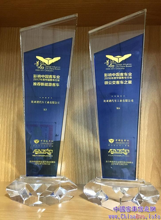 12月份,在由中國(guó)客車(chē)網(wǎng)、中國(guó)土木工程學(xué)會(huì)城市公共交通分會(huì)舉辦的影響中國(guó)客車(chē)業(yè)系列活動(dòng)上,比亞迪K6純電動(dòng)公交車(chē)再次獲選“影響中國(guó)客車(chē)業(yè)-2016年度中國(guó)客車(chē)行業(yè)微公交客車(chē)之星”及“影響中國(guó)客車(chē)業(yè)-2016年度智能化客車(chē)之星”;同時(shí)在此次活動(dòng)中,比亞迪純電動(dòng)公交領(lǐng)域的另一代表之作——K8純電動(dòng)公交車(chē)也榮獲“影響中國(guó)客車(chē)業(yè)-2017年度中國(guó)客車(chē)行業(yè)推薦新能源客車(chē)”。