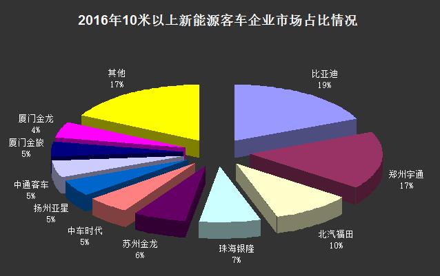 值得一提的是,比亞迪商用車10米以上新能源大客車的銷售情況格外搶眼。2016年,整個新能源市場10米以上大客車共銷售56958輛,銷量排名前十的企業(yè)共銷售47017輛,占比約83%。