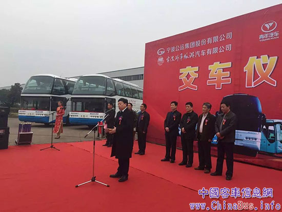 金華青年制造有限公司副總裁陳朝梁和寧波外事旅游汽車有限公司總經(jīng)理應(yīng)豪進行了交接金鑰匙儀式。