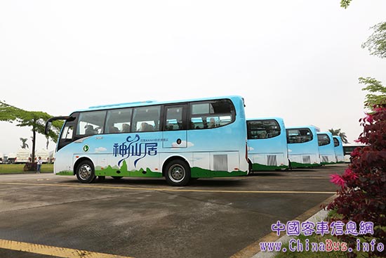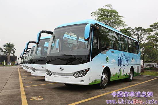 4月26日,十輛XMQ6802AY已交付神仙居旅游集團(tuán)。蔚藍(lán)基調(diào)的車身上,青峰座座,白云悠悠,讓人心生神往。據(jù)悉,該批車輛將于近期投入使用,接送游客從神仙居旅游景區(qū)集散中心到景區(qū)南門和北門?!吧讲辉诟撸邢蓜t名;水不在深,有龍則靈。”一輛輛美觀舒適的金龍客車,穿梭于仙山綠水中,為這5A級(jí)景區(qū)又增添了一道靚麗的風(fēng)景。