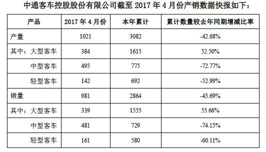 5月6日,中通客車控股股份有限公司發(fā)布2017年4月份產(chǎn)銷快報(bào)??靾?bào)顯示,1-4月,中通客車?yán)塾?jì)銷售客車2864輛,同比下降45.69%。其中,大型客車銷售1555輛,同比增長55.66%;中型客車銷售729輛,同比下降74.15%;輕型客車銷售580輛,同比下降60.11%。