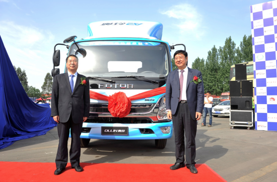 【中國物流與采購聯(lián)合會副會長蔡進先生與福田商用汽車集團副總裁、輕型商用車業(yè)務總監(jiān)趙建民先生為福田奧鈴EV純電動超級輕卡新品揭幕】