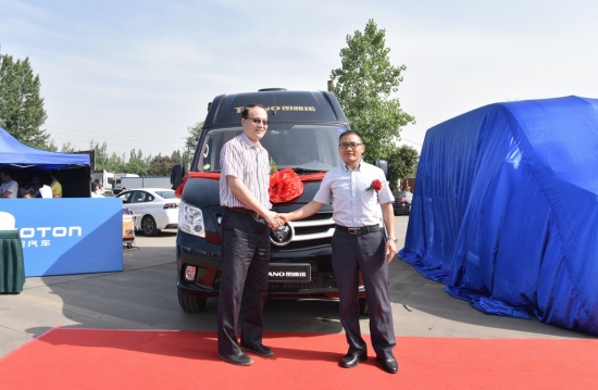 【福田商用汽車集團商務汽車業(yè)務總監(jiān)、輕型商用車事業(yè)本部執(zhí)行副本部長潘林波先生向四川富臨運業(yè)集團股份有限公司車輛技術管理部總監(jiān)羅明飛先生遞交福田圖雅諾車鑰匙】