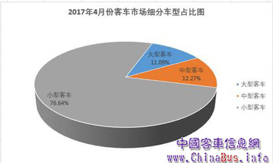 據(jù)中國汽車工業(yè)協(xié)會統(tǒng)計,2017年4月份,國內(nèi)客車(含非完整車輛)市場產(chǎn)銷37560輛和35268輛,生產(chǎn)環(huán)比下降9.48%,同比下降20.57%;銷售環(huán)比下降14.14%,同比下降21.61%,銷量降幅較上月(-17.68%)有所擴(kuò)大。分車型看,大型、中型和輕型客車在4月份分別銷售3911輛、4329輛和27028輛,分別占4月份客車市場份額的11.09%、12.27%和76.64%。