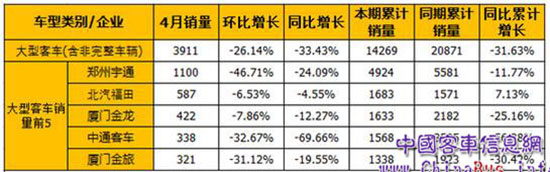 2017年4月份,大型客車(含非完整車輛)僅銷售3911輛,環(huán)比下降26.14%,同比下降33.43%,銷量增幅從上月(+0.90%)轉(zhuǎn)為負(fù)增長。4月份,大型客車(含非完整車輛)銷量前5的企業(yè)依次為鄭州宇通、北汽福田、廈門金龍、中通客車和廈門金旅,5家合計銷售2768輛,占大型客車(含非完整車輛)4月總銷量3911輛的70.77%。