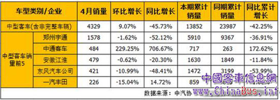 上表可見,環(huán)比上月,中型客車(含非完整車輛)銷量排名前五企業(yè)僅中通客車一家實現(xiàn)增長,增幅達(dá)到驚人的229.25%;與2016年同期相比,則有中通客車和一汽豐田兩家企業(yè)實現(xiàn)增長,增幅最高的還是中通客車,達(dá)到706.67%。4月份,中型客車(含非完整車輛)銷量前五企業(yè)中,中通客車實現(xiàn)了環(huán)比、同比雙正增長,而鄭州宇通、安徽江淮和東風(fēng)汽車公司三家企業(yè)則遭遇了環(huán)比、同比雙降。從累計銷量看,2017年前4月,中型客車(含非完整車輛)市場僅累計銷售13852輛,同比累計大降42.25%。具體到4月銷量前五企業(yè)來看,中通客車和一汽豐田兩家企業(yè)實現(xiàn)增長53.99%,比去年前4月少銷售了1727輛,排名首位的鄭州宇通前4月累計銷售5910輛,同比累計下降36.91%,比去年前4月少銷售了3457輛。