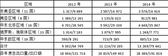 表1 2011-2014年我國(guó)大中型(6 m以上)客車向沿線國(guó)家出口數(shù)量/出口金額 輛/萬(wàn)美元