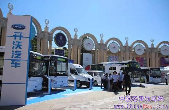 ▲ 組團(tuán)亮相今年北京道路運(yùn)輸展的南京金龍開(kāi)沃汽車(chē)