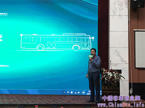 湘潭市公共交通有限公司副總經(jīng)理郭強(qiáng)在交流會(huì)現(xiàn)場(chǎng)分享新能源公交運(yùn)行經(jīng)驗(yàn)