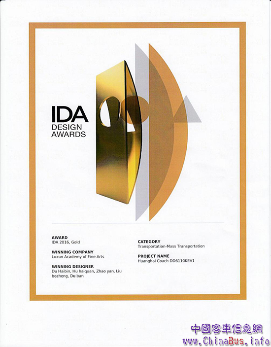 本屆“IDA國(guó)際設(shè)計(jì)大賽”共有來(lái)自全球200多個(gè)國(guó)家和地區(qū)的選手參加,面向全球征集已經(jīng)投產(chǎn)上市的兩年之內(nèi)的優(yōu)秀產(chǎn)品設(shè)計(jì),共收到來(lái)自全球52個(gè)國(guó)家萬(wàn)余件投產(chǎn)作品。其中,黃??蛙嚺c魯美設(shè)計(jì)學(xué)院團(tuán)隊(duì)協(xié)同設(shè)計(jì)的“Huanghai coach DD6110KEV1黃海純電動(dòng)城際客車”是中國(guó)參賽交通機(jī)具類比賽的唯一金牌獲得者,縱觀中國(guó)客車業(yè)可謂“前無(wú)古人”。