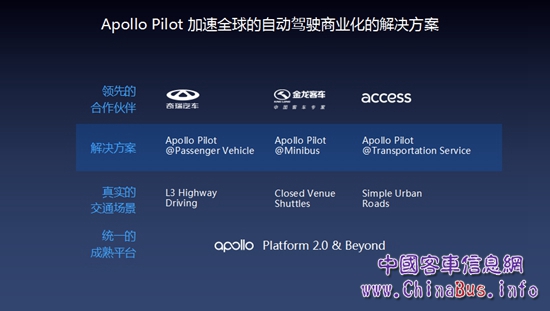 Apollo的產(chǎn)品化、量產(chǎn)化、解決方案化進程也在創(chuàng)造“中國速度”。孫勇義介紹,自動駕駛產(chǎn)品Apollo Pilot與奇瑞、金龍以及綜合運輸服務商Access等合作伙伴的落地進展,涵蓋了乘用車、公共巴士和輔助客運服務等多種場景。