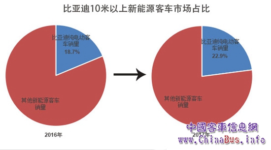 除銷量實現(xiàn)逆勢增長外,比亞迪市場份額也再次得到提升。由以上數(shù)據(jù)可以得出,2017年,比亞迪新能源客車銷量市場占比為16.5%,相比2016年的12.5%,提升了4個百分點。