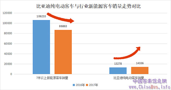 據(jù)中國客車統(tǒng)計信息網(wǎng)最新數(shù)據(jù)顯示,2017年,國內(nèi)7米以上新能源客車共銷售86863輛(含廣汽比亞迪1559輛),相比2016年的106233輛,同比下降18.2%。而比亞迪純電動客車全年銷量為14336輛(含控股公司廣汽比亞迪1559輛),同比增長8%。