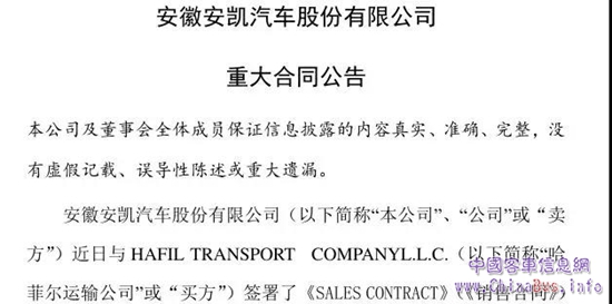 2月5日,安徽安凱汽車股份有限公司發(fā)布重大合同公告,2月5日,安徽安凱汽車近日與HAFIL TRANSPORT COMPANYL.L.C.(哈菲爾運(yùn)輸公司)簽署了《銷售合同》。