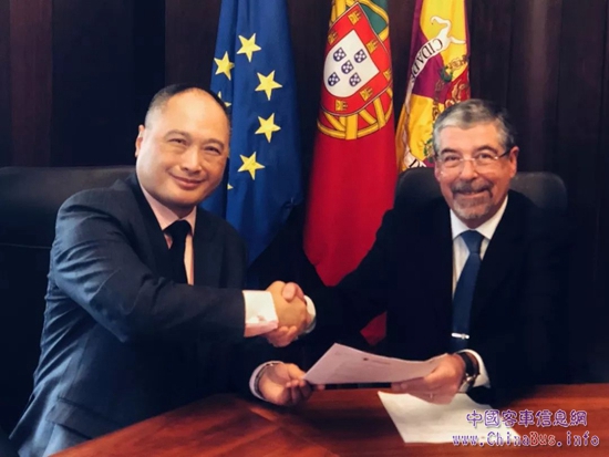 比亞迪歐洲責(zé)任有限公司總經(jīng)理何一鵬(圖左)與科英布拉市市長(zhǎng)馬沙多(圖右)簽署協(xié)議