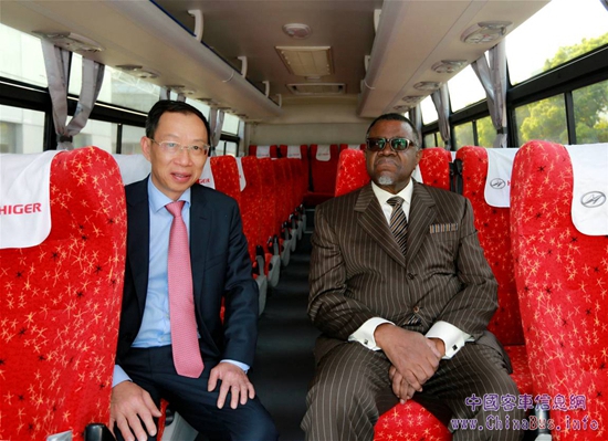 根哥布總統(tǒng)對海格客車規(guī)模化、專業(yè)化的客車制造水平贊嘆有加。他表示,隨著全球合作的不斷加深,會(huì)有更多的中國企業(yè)去納米比亞投資,實(shí)現(xiàn)互惠共贏,他期望海格客車為納米比亞交通裝備事業(yè)發(fā)展做出貢獻(xiàn)。在體驗(yàn)海格出口到納米比亞的旅游客車時(shí),他饒有興趣地了解了該車的性能特點(diǎn),并表示這款車非常豪華,乘坐也非常舒適,對促進(jìn)納米比亞的旅游客運(yùn)事業(yè)會(huì)有很大的幫助。黃書平向根哥布總統(tǒng)贈(zèng)送了象征美好祝愿的海格車模,并表示期待與納米比亞深入合作,讓更多的海格客車更好地服務(wù)于納米比亞人民的交通出行,促進(jìn)納米比亞交通運(yùn)輸事業(yè)的發(fā)展。