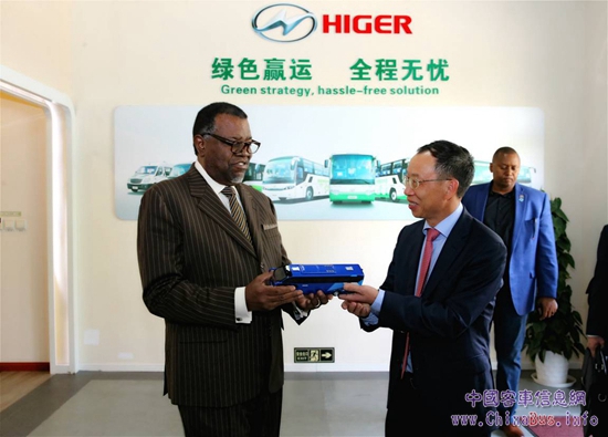 海格客車總經(jīng)理黃書平向根哥布總統(tǒng)介紹了公司發(fā)展歷程、產(chǎn)品技術(shù)研發(fā)、新能源客車推廣應(yīng)用以及海外出口等情況。根哥布總統(tǒng)參觀了海格展廳,并登車體驗(yàn)了海格即將出口到納米比亞的9米旅游客車。