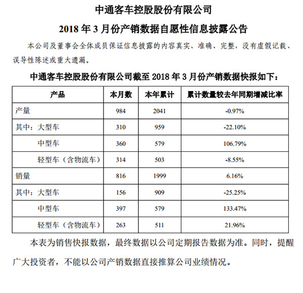 4月9日,中通控股股份有限公司(以下簡(jiǎn)稱“中通客車”)發(fā)布2018年3月份產(chǎn)銷快報(bào)??靾?bào)顯示,3月,中通客車共計(jì)銷售各類客車(含物流車)816輛。