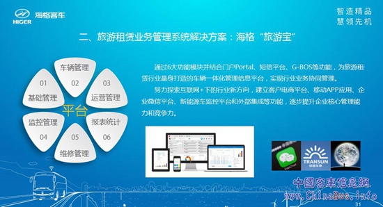 第三,則是更智能化。源自于海格客車G-BOS大數(shù)據(jù)智慧客車市場應(yīng)用積累及運(yùn)營管理數(shù)據(jù)支撐,利用大數(shù)據(jù)分析可讓量身定制的海格旅游客車更智能,更安全,更舒適。海格“旅游寶”應(yīng)用互聯(lián)網(wǎng)+思維,實(shí)現(xiàn)了運(yùn)營管理的信息化管理,讓業(yè)務(wù)流程更簡便,可查詢,可沉淀,從車輛管理到業(yè)務(wù)經(jīng)營助力客戶實(shí)現(xiàn)管理升級。