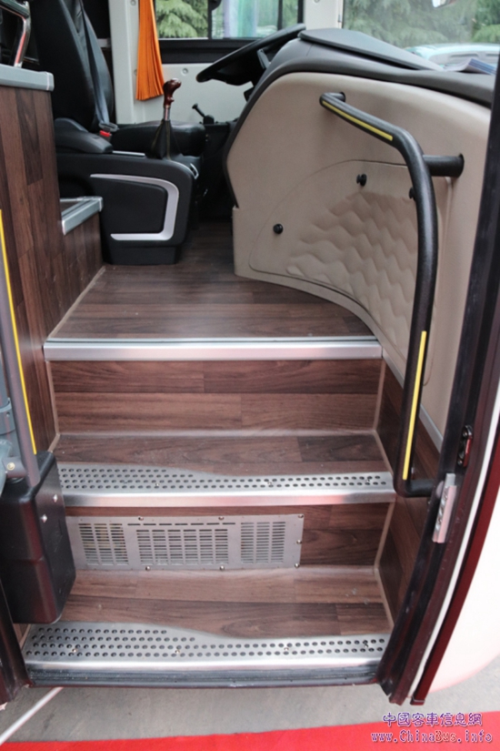 從登車入口處開始就能感受到與原有產(chǎn)品的不同,仿木紋地板革包裹的臺階做了防滑處理,從視覺和實(shí)際感受上會給乘客帶來貼心和穩(wěn)重感。在乘客視線可及范圍內(nèi),盡量都采用軟化和啞光處理,減少金屬帶來的冰冷和刺目感。在乘客與駕駛區(qū)等分區(qū)隔斷處理上,雖不如領(lǐng)航者那樣繁復(fù),但簡潔的材料和處理方式起到了類似的效果。