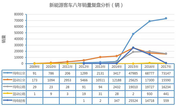 新能源客車(chē)市場(chǎng)銷(xiāo)量規(guī)模復(fù)盤(pán)分析:截止2017年,新能源客車(chē)5.8米以上銷(xiāo)量389022輛,其中純電動(dòng)公交車(chē)197839輛,混合動(dòng)力公交車(chē)銷(xiāo)量90900輛,純電動(dòng)公路客車(chē)銷(xiāo)量57668輛,混合動(dòng)力公路客車(chē)銷(xiāo)量1464輛,純電輕客銷(xiāo)量41151輛。