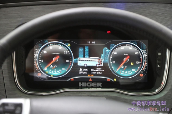 儀表盤(pán)摒棄了傳統(tǒng)的指針表式設(shè)計(jì),取而代之的是相當(dāng)先進(jìn)的全LED液晶儀表盤(pán)。儀表盤(pán)包括了發(fā)動(dòng)機(jī)轉(zhuǎn)速、時(shí)速、油量、水溫、制動(dòng)氣壓表以及中間的車(chē)況表,如果要通過(guò)一個(gè)LED液晶顯示器顯示這么多東西首先就需要CAN總線(xiàn)技術(shù)的支持,CAN總線(xiàn)將各個(gè)檢測(cè)元件的數(shù)據(jù)實(shí)時(shí)反饋到顯示器上。所以說(shuō)這套設(shè)計(jì)不單純是美觀,還可以從中感受到當(dāng)代客車(chē)已經(jīng)邁入了智能化時(shí)代,而海格全系列客車(chē)都已匹配其自主研發(fā)的CAN總線(xiàn)。