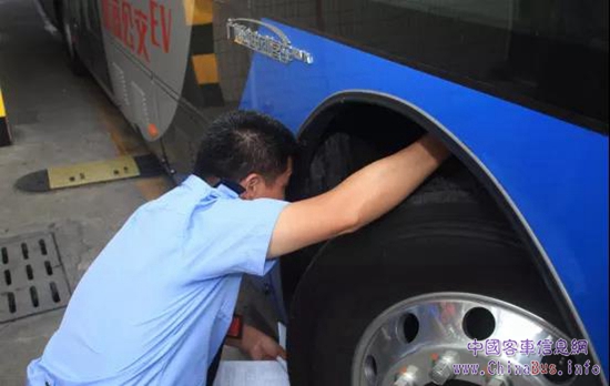經(jīng)過一系列檢查和記錄,兩臺通過查驗的公交車駛離檢測線,緊隨的兩臺車又駛上檢測線。如此往復(fù),當(dāng)天要完成115臺純電動車的查驗。
