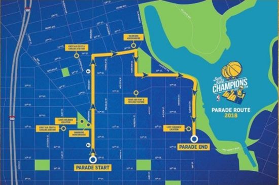 根據(jù)慶典路線安排,勇士的游行從奧克蘭的百老匯第11街出發(fā),然后在百老匯第20街右轉(zhuǎn),之后再從哈里森那里右轉(zhuǎn)到百老匯第19街,再右轉(zhuǎn)到湖岸道,最后在奧克蘭國際機(jī)場(chǎng)和百老匯第13街結(jié)束。