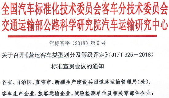6月20日,全國汽車標準化技術委員會客車分技術委員會與交通運輸部公路科學研究院汽車運輸研究中心共同發(fā)布了關于召開《營運客車類型劃分及等級評定》(JT/T325—2018)標準宣貫會議的通知。