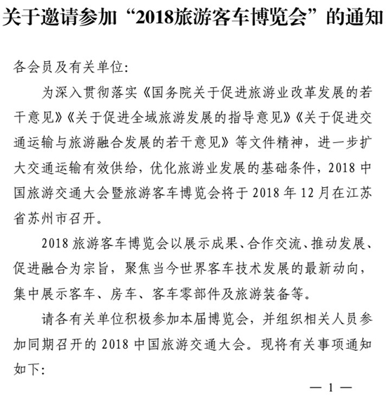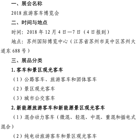12月4日—7日,由中國公路學(xué)會(huì)主辦的2018旅游客車博覽會(huì)將在蘇州隆重召開,本次博覽會(huì)將作為旅游客車市場的“風(fēng)向標(biāo)”,重點(diǎn)聚焦世界客車發(fā)展的最新動(dòng)向。以下為通知原文: