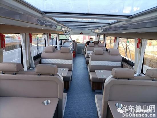 2輛車全部是純電動(dòng),全景天窗,車內(nèi)幾乎可實(shí)現(xiàn)360度觀景,車身被涂為艷麗的橘黃色,行駛在路上十分亮眼。