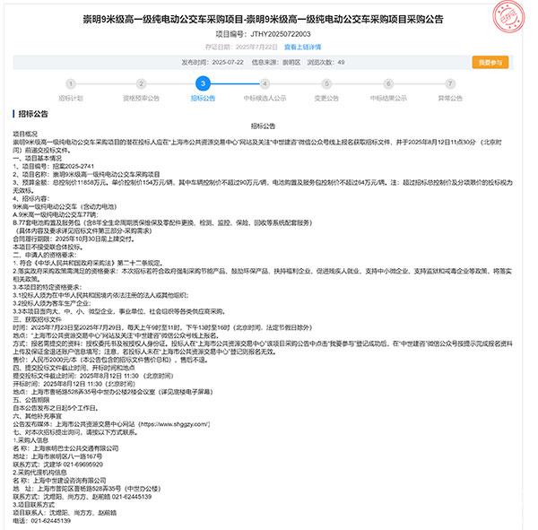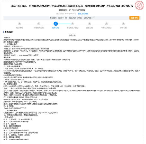 2025年7月22日,上海崇明巴士公共交通有限公司通過上海市公共資源交易中心,發(fā)布了2025年新能源城市公交車采購招標(biāo)公告,擬投入采購預(yù)算資金17037萬元,批量集中采購新能源城市公交車118輛。