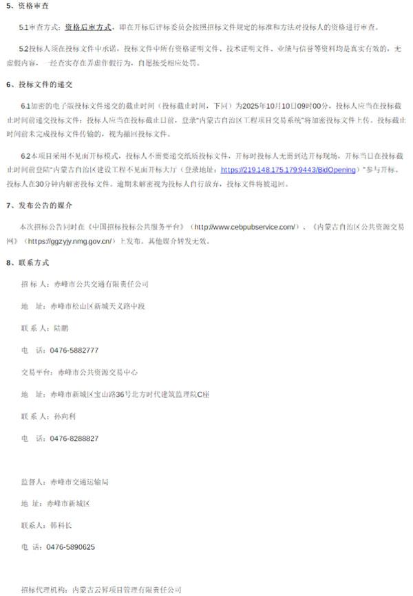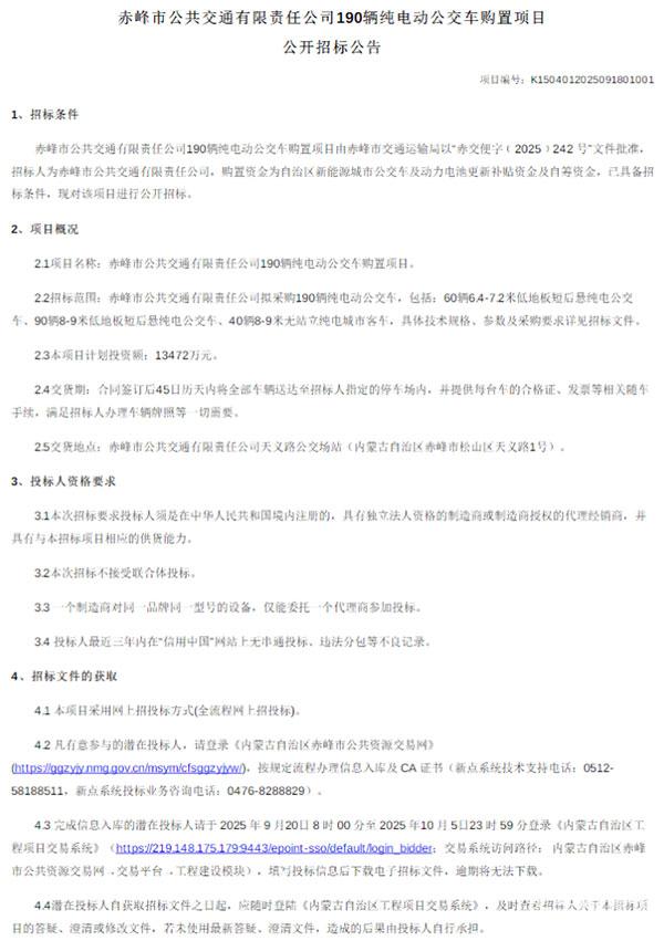 內(nèi)蒙古赤峰市公共交通有限責(zé)任公司190輛純電動公交車購置項目公開招標(biāo)公告