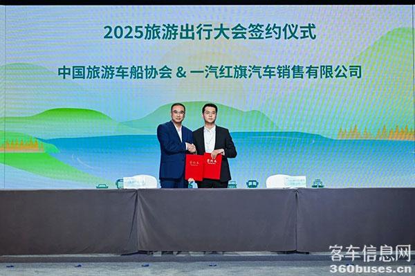 中國旅游車船協(xié)會(huì)副會(huì)長侯樂君與一汽紅旗汽車銷售有限公司公域事業(yè)戰(zhàn)略營銷部總監(jiān)劉得利簽約